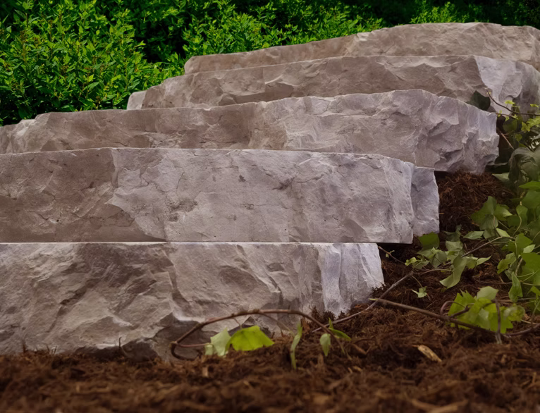 Precast concrete stacking steps reminiscent of centuries-old stone. Each step is uniquely random creating a sophisticated design.